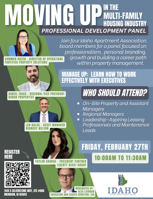 Join a panel of Idaho Apartment Association executive board members for Moving Up in the Multi‑Family Housing Industry. Learn how to manage up, build your brand, and map a path to leadership from pros who have done it.